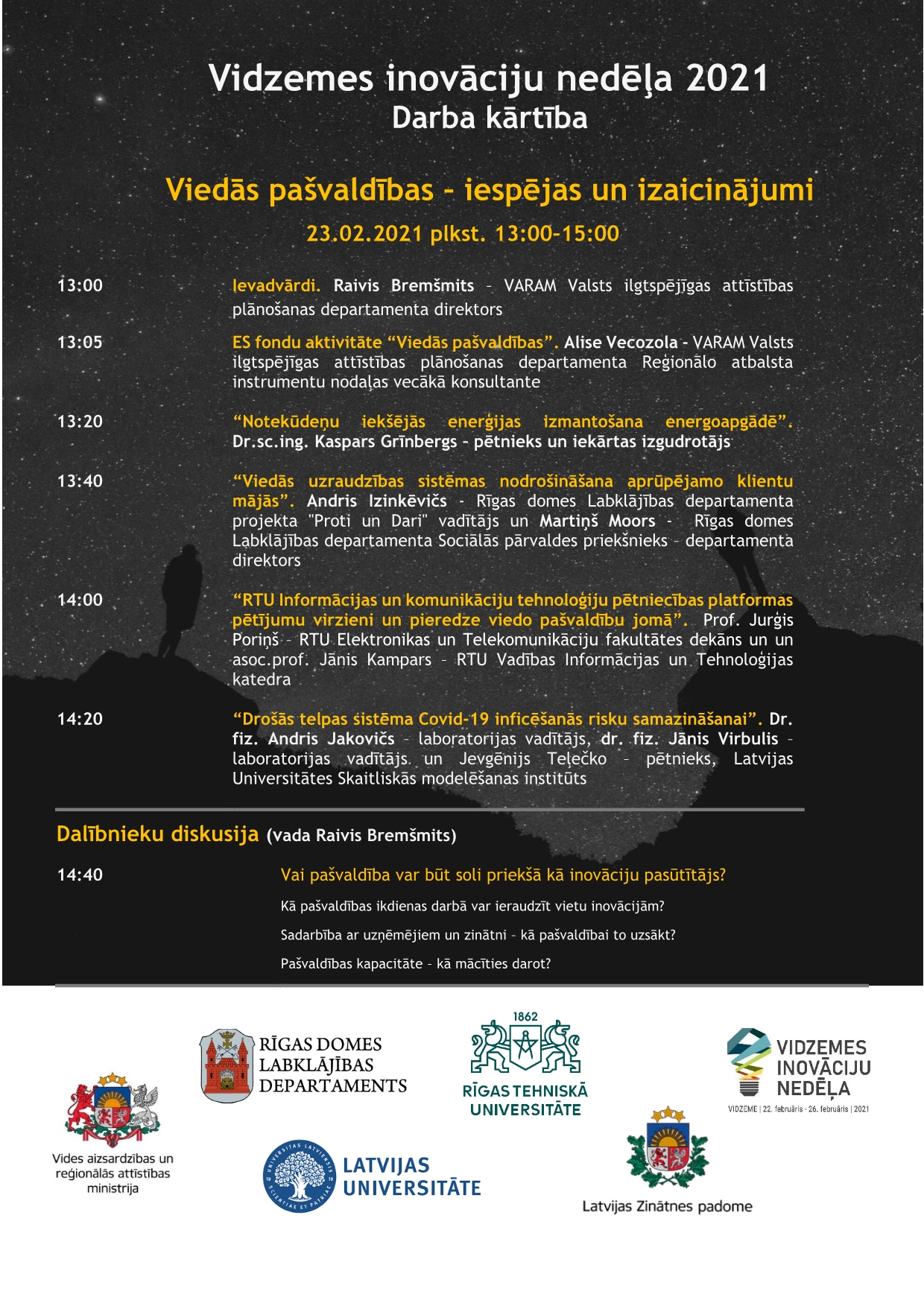 Lai iedvesmotu pašvaldības jaunām projektu idejām, pasākumā piedalīsies viedu un inovatīvu projektu īstenotāji sociālās aprūpes jomā (Rīgas domas Labklājības departaments, kas īsteno projektu “Viedās uzraudzības sistēmas nodrošināšana aprūpējamo klientu mājās”) un komunālo pakalpojumu jomā (pētnieks dr.sc.ing. Kaspars Grīnbergs, kura risinājums ir īstenots Ogres novada bibliotēkā “Notekūdeņu iekšējās enerģijas izmantošana energoapgādē”). Piedalīsies zinātnieki, kas piedāvā jaunus risinājumus sabiedrības veselībai un drošībai (Latvijas Universitātes zinātnieki dr. fiz. Andris Jakovičs, dr. fiz. Jānis Virbulis un Jevgēņijs Teļečko, kuri informēs par jaunu projekta ideju “Drošās telpas sistēma Covid-19 inficēšanās risku samazināšanai”). VARAM pasākumā piedalīsies arī RTU pētījumu platformas “Informācijas un komunikāciju tehnoloģijas” pārstāvji prof. Jurģis Poriņš un dr. sc. ing. Katrina Boločko, kas informēs par pētniecības platformas sniegtajām pētniecības un sadarbības iespējām jaunu projektu ideju attīstībai. UZMANĪBU! TIEŠRAIDES LOGS ATRODAS ZEMĀK!