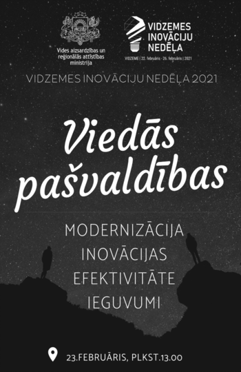VARAM “Vidzemes inovāciju nedēļas ietvaros 2021” 23.februārī aicina piedalīties tiešsaistes informatīvā pasākumā “Viedās pašvaldības – iespējas un izaicinājumi”. Pasākuma mērķis ir iepazīstināt pašvaldības, uzņēmējus, zinātniekus un citus interesentus par jaunā Eiropas Savienības fondu plānošanas perioda aktivitāti “Viedās pašvaldības”, kā arī iedvesmot potenciālos projektu iesniedzējus jaunām un inovatīvām idejām.